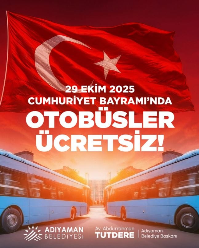 Cumhuriyet Bayramı’nın 102’inci yıl dönümüne sayılı günler kala, Adıyaman Belediyesi vatandaşları sevindiren bir karar aldı. Belediye, 29 Ekim’de otobüslerin ücretsiz olacağını duyurdu.
