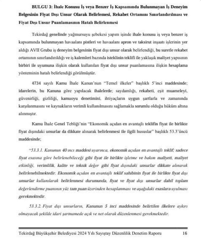 Sayıştay’ın hazırladığı rapora göre, Tekirdağ Büyükşehir Belediyesi‘nin ‘yağmursuyu şebekesi’ ihalesinde şaşkına çeviren bir şart konuldu. İhaleye girecek firmalardan söz konusu olan ‘yağmursuyu şebekesi’ ile ilgili olmayan ‘havaalanı pisti ve apron işleri için deneyim belgesi’ talep edildi.