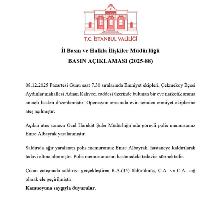 İSTANBUL (İGFA) – İstanbul Valiliği, 8 Aralık 2025 Pazartesi günü saat 07.30 sıralarında Çekmeköy Aydınlar Mahallesi Adnan Kahveci Caddesi’nde polis ekiplerine yönelik silahlı saldırı gerçekleştiğini açıkladı. Narkotik amaçlı arama sırasında bir adresten güvenlik güçlerine ateş açıldığı, ekiplerin meşru müdafaa kapsamında karşılık verdiği belirtildi.