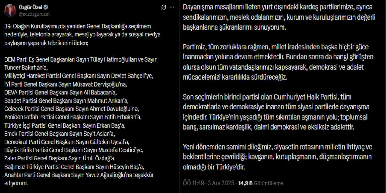Tebriklerin telefon, sosyal medya paylaşımları ve mesajlarla kendisine ulaştığını ifade eden Özgür Özel paylaşımında tebriklerini ulaştıran genel başkanlara ayrıca yer vererek isimleri şu şekilde açıkladı: