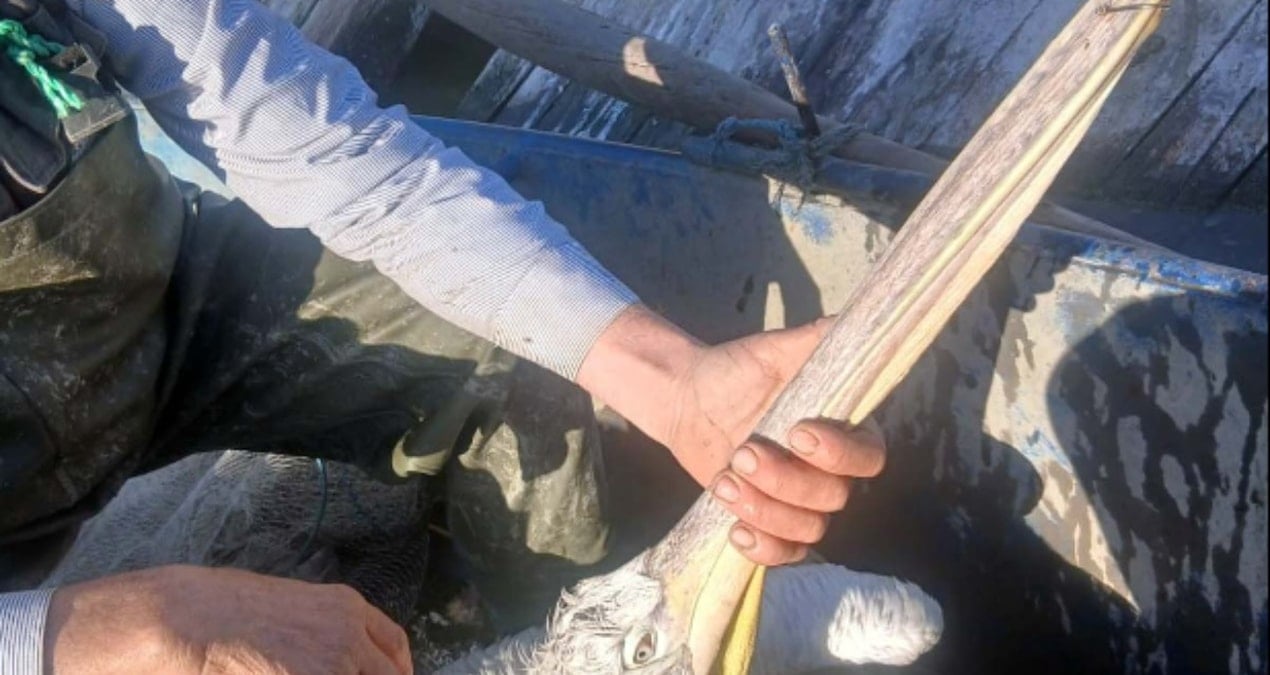 Gagasına olta iğnesi takılan pelikanı balıkçıların dikkati kurtardı