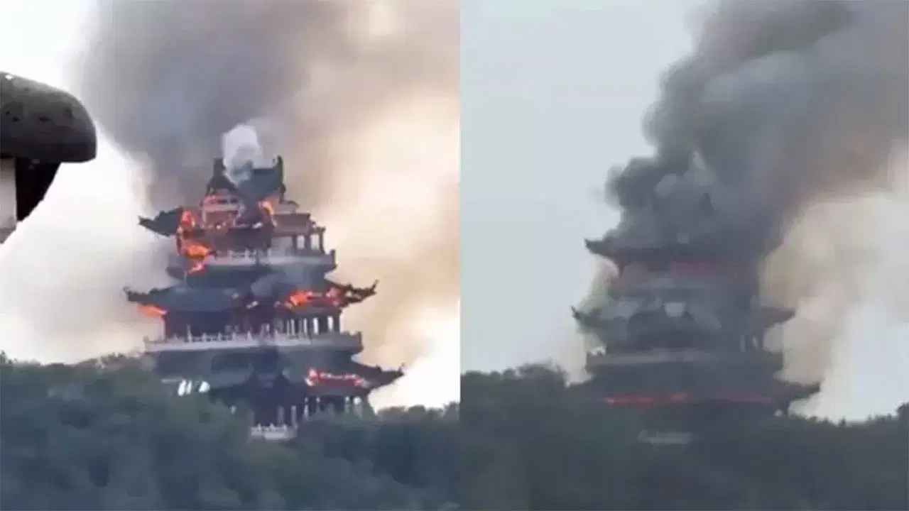 Çin’in Jiangsu eyaletindeki 1500 yıllık Yongqing Tapınağı’nda yer alan üç katlı ahşap Wenchang Köşkü’nde bir ziyaretçinin tütsü ve mumları hatalı kullanması sonucu yangın çıktı.