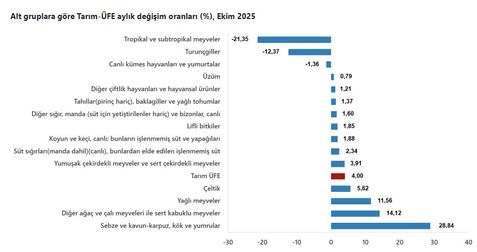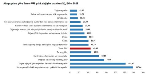Tarım ürünleri üretici fiyat endeksi (Tarım-ÜFE) Ekim’de aylık bazda yüzde 4 yükselirken, yıllık bazda yüzde 45,40 arttı. Endekste, bir önceki yılın Aralık ayına göre yüzde 34,06 artış ve on iki aylık ortalamalara göre yüzde 38,83 artış gerçekleşti.